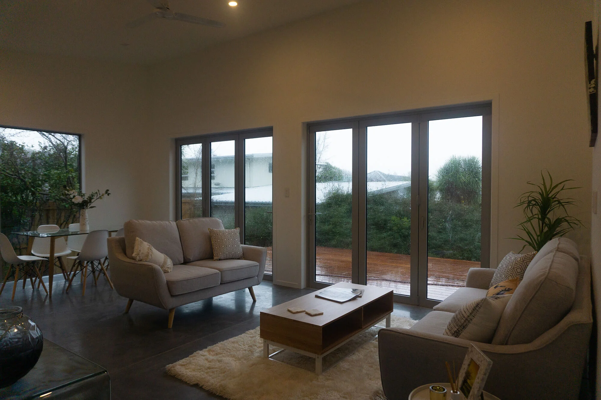 Oriented to capture all day sun and then store that warmth with an exposed and polished concrete floor means the days warmth last long after the sun and gone down, and into the following days.